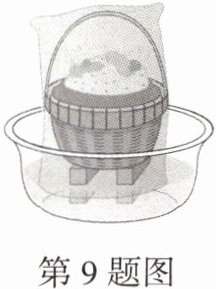 9. 趋势情境 小制作 如图所示,夏季盛一盆凉水,在盆里放几块砖头将竹篮垫高,再把一个湿纱布袋罩在篮子上,并使袋口的边缘浸入水中,将其放在阴凉通风处,能短暂保存食物. 其利用的原理是:______,篮子上罩湿纱布是通过______的方式来加快这一过程的.