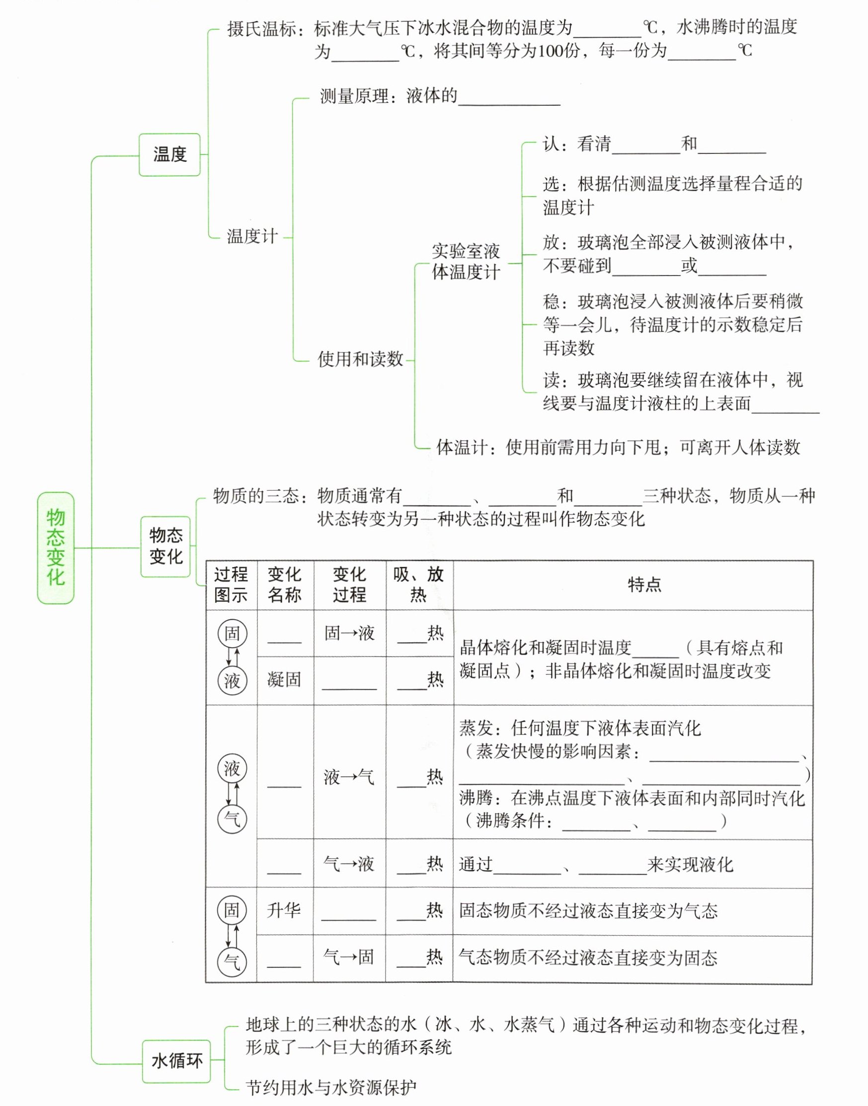 物质的三态:物质通常有______、______和______三种状态,物质从一种状态转变为另一种状态的过程叫作物态变化