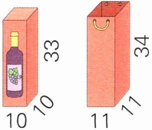 4. 下面是一个长方体红酒礼盒和它的手提袋。红酒礼盒的体积是多少立方厘米?做这样一个手提袋至少需要多少平方厘米卡纸?(重叠部分忽略不计)(单位:cm)
