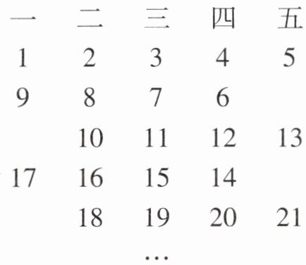 【解析】把除1以外的每两行看成一个周期,也就是8个数为一组,每一组的编号分别在第二列、第三列、第四列、第五列、第四列、第三列、第二列、第一列。2024-1=2023,2023÷8=252(组)……7(个),2024是第253组中的第7个编号,在第二列。