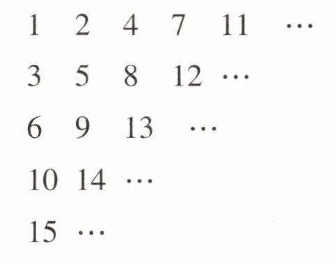 【解析】观察发现,第1斜行有1个数,第2斜行有2个数,第3斜行有3个数……第100斜行有100个数,前面99斜行共有1+2+3+…+99=4950(个)数,则4951为第100斜行第1个数,即第1行第100个数。