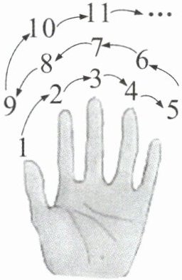 3 请同学们伸出左手,如下图那样,从大拇指开始依次数数,数到100时,数在哪根手指上?
