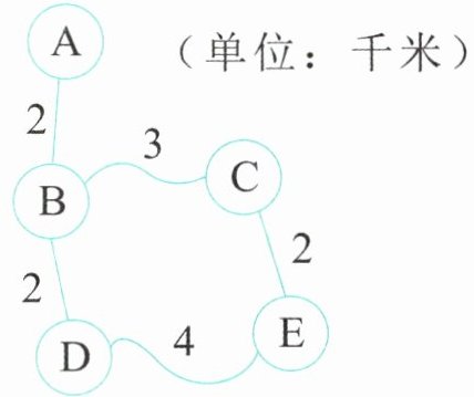 15 $ A,B,C,D,E $ 五所学校之间有公路相通(如图,图上标出每段公路的长度),现要在其中一所学校召开一次学生代表会议,应出席会议的 $ A $ 校有代表 $ 6 $ 人,$ B $ 校有代表 $ 4 $ 人,$ C $ 校有代表 $ 8 $ 人,$ D $ 校有代表 $ 7 $ 人,$ E $ 校有代表 $ 10 $ 人。为使参加会议的代表所走路程总和最小,会议应在哪所学校召开?