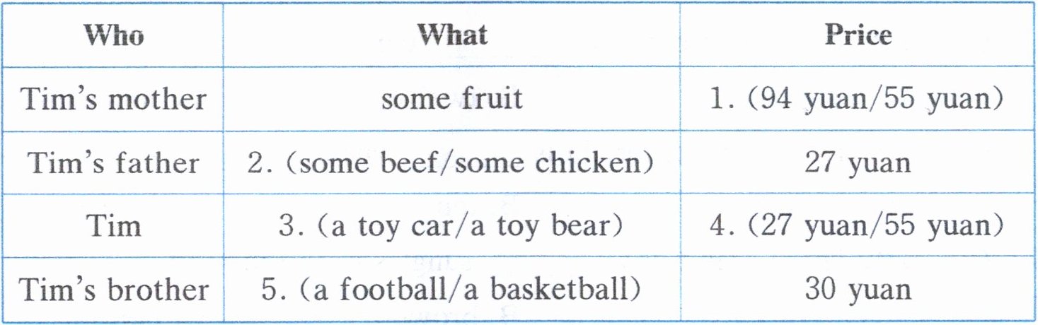 | Tim | 3. (a toy car/a toy bear) | 4. (27 yuan/55 yuan)|