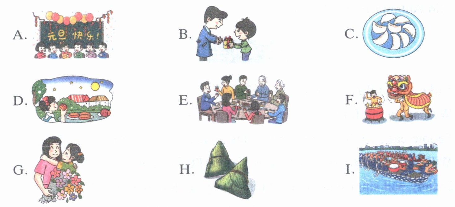 ( ) 1.famous ( ) 2. dance ( ) 3. December ( ) 4. on holiday ( ) 5. mooncakes ( ) 6. Women's Day ( ) 7. a nice party ( ) 8. in June