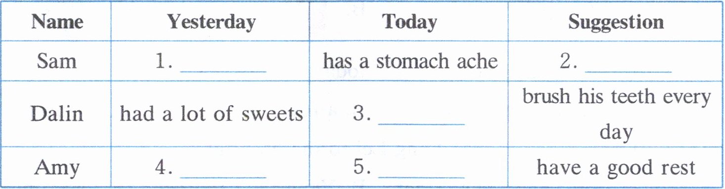 | Sam | 1. ______ | has a stomach ache | 2. ______ |
