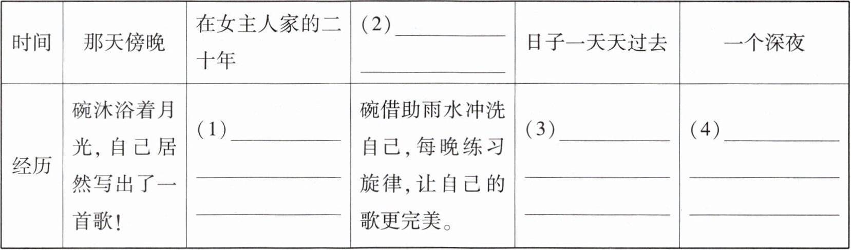 |经历|碗沐浴着月光 ,自己居然写出了一首歌!|(1)______|碗借助雨水冲洗自己,每晚练习旋律 ,让自己的歌更完美。 |(3)______ |(4)______ |