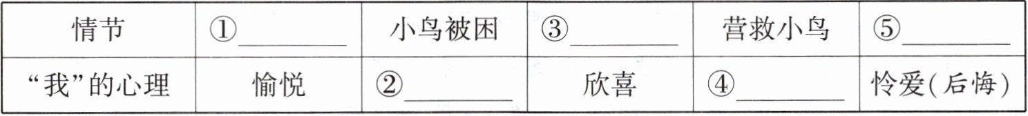 |"我"的心理|愉悦|②______|欣喜|④______|怜爱(后悔)|