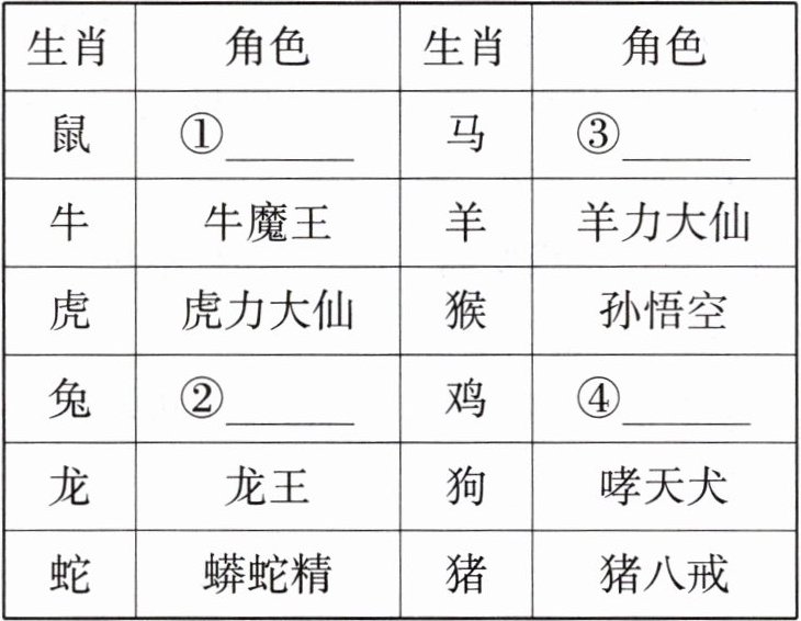 (1)本次篝火晚会邀请了许多《西游记》中的动物朋友,请你补全嘉宾名单。(4 分)