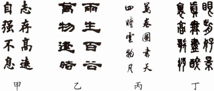 (3)B(甲字体笔画规整,结构严谨,横平竖直,每一笔画形态较为固定,具有楷书笔画规整、结构端庄的特点,所以甲是楷书。乙字体笔画具有波折之美,蚕头雁尾特征明显,这是隶书的典型特点,隶书的笔画较为扁平,起笔和收笔有独特的形态,所以乙是隶书。丙字体笔画连绵,书写流畅自然,有行云流水之感,在一定程度上简化了笔画,且注重笔画间的呼应和连贯,符合行书书写便捷、灵动流畅的特征,所以丙是行书。丁字体笔画圆润婉转,线条粗细基本一致,呈现出古朴典雅的形态,这与小篆笔画规整、线条匀净的特点相契合,所以丁是小篆。故选B)(2分)
