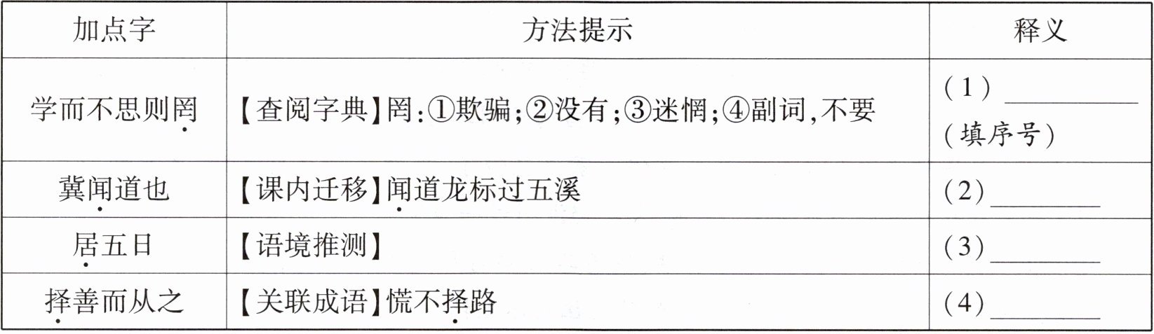 |学而不思则罔|【查阅字典】罔:①欺骗;②没有;③迷惘;④副词,不要|(1)______(填序号)|