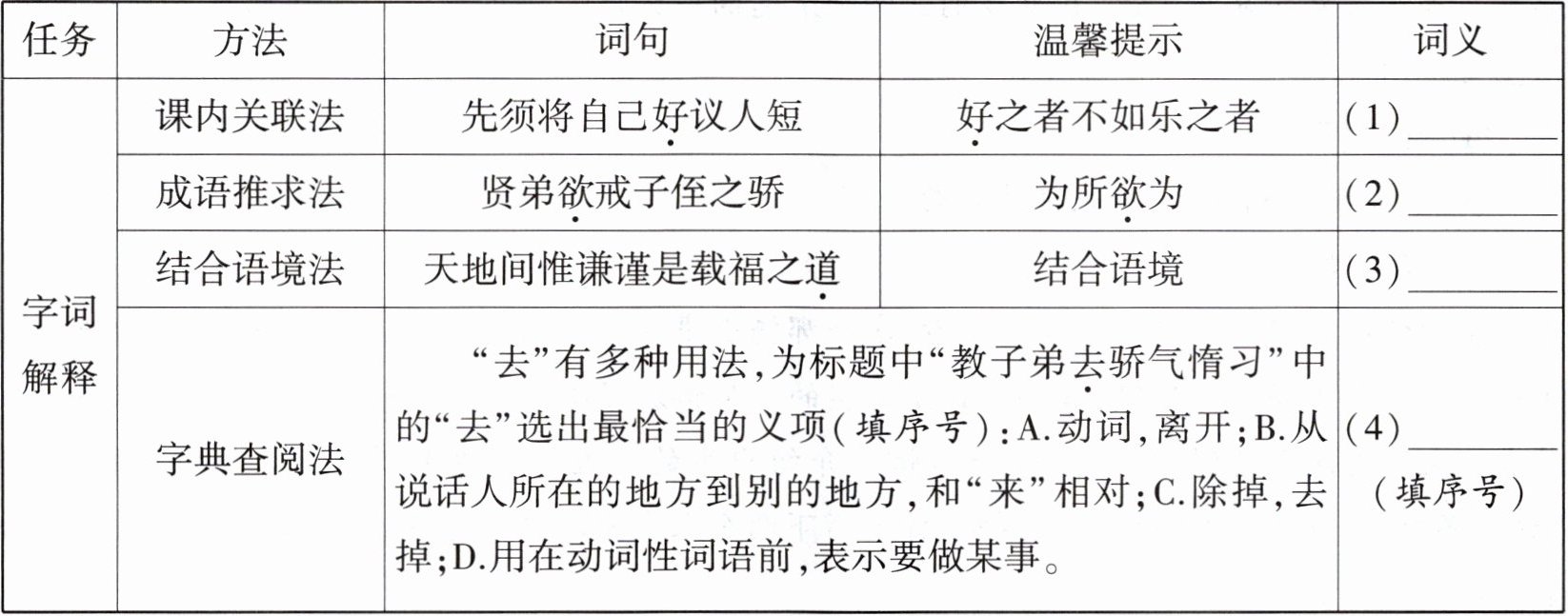 |字词解释|课内关联法|先须将自己好议人短|好之者不如乐之者|(1)______|
