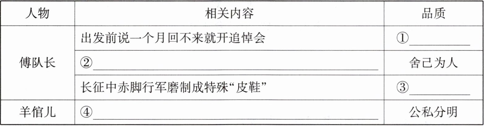 5. ①英勇无畏 ②用脚上的皮鞋换来全队口粮 ③顽强坚毅 ④不用公家的羊而用自家鸡蛋换皮鞋(4分,每空1分)