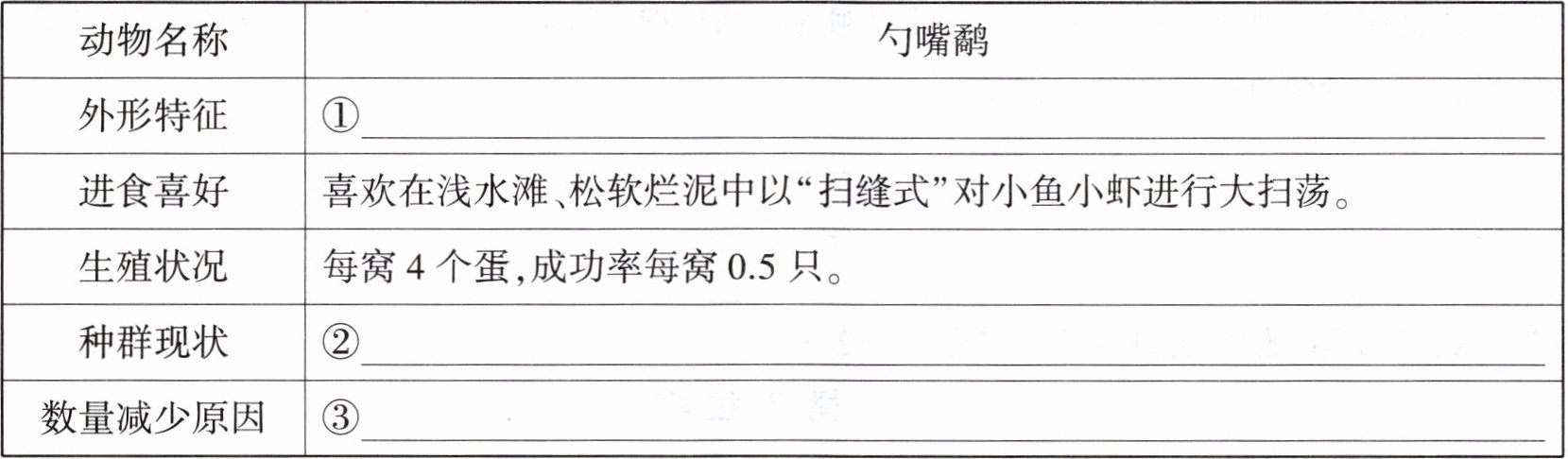 5.①体长15厘米左右,圆头圆脑,嘴巴呈铲状,酷似一把勺子。②其数量正以每年5%的速度减少,已被列入"极危物种"名单。③城市建设、过度开发、环境污染、气候变化,以及盗猎者的捕杀等人类行为。(3分,每空1分)