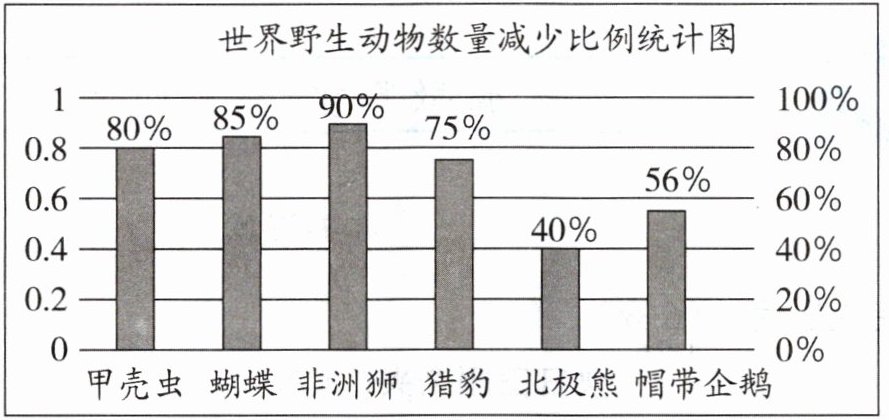 7. 阅读世界野生动物数量减少比例统计图,说说你读出的世界野生动物生存的情况。(2 分)______