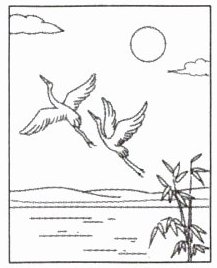 形象描绘:皓月当空,平静的湖面上,两只洁白如雪的鹤翩翩而飞,似乎要冲破这晚秋的云烟,直抵云霄。______