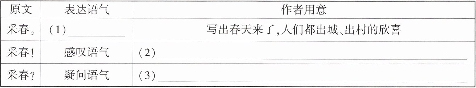 3."采春。""采春!""采春?"文中连续出现三个"采春",分别被赋予不同的标点符号,结合文章内容分析这三个标点依次蕴含了作者怎样的用意,将下面的表格补充完整。(3 分)