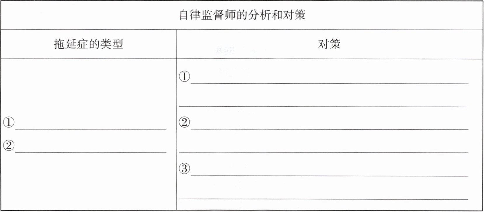 5. 下面是一位学生身份的拖延症患者某个周日的观察记录。假如你是一位自律监督师,请根据材料二和材料三分析他拖延症的类型并给出对策。(5 分)