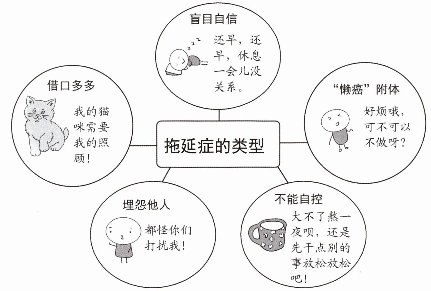 心理学家认为,“拖延”是一种普遍的心理和行为现象。每个人都会有不同程度的拖延行为。当拖延行为成为一种牢固的行为习惯时,那就是患上了拖延症。拖延症是一种心理疾病,会给个人的学习、工作、生活和身心健康带来消极影响。患有拖延症的人往往会产生自责情绪和负罪感,不断地否定自我,严重的还会伴有焦虑症、抑郁症。调查表明:50%的中学生认为自己有拖延症,80%的大学生认为自己有拖延症,86%的职场人认为自己有拖延症,其中 50%的职场人不拖到最后一刻不开始工作。拖延症常见的类型如下图: