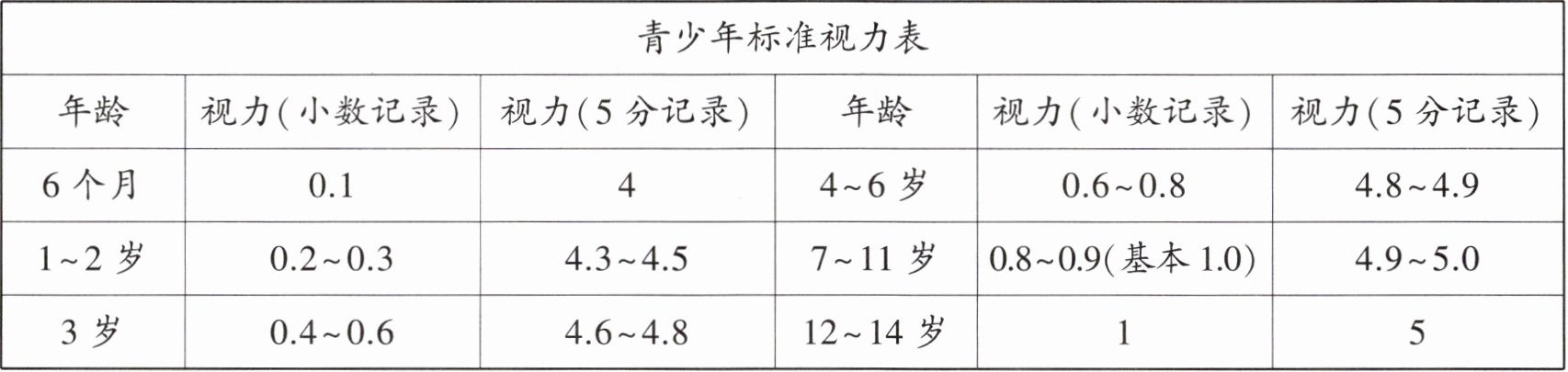 | 年龄 | 视力(小数记录) | 视力(5分记录) | 年龄 | 视力(小数记录) | 视力(5分记录) |