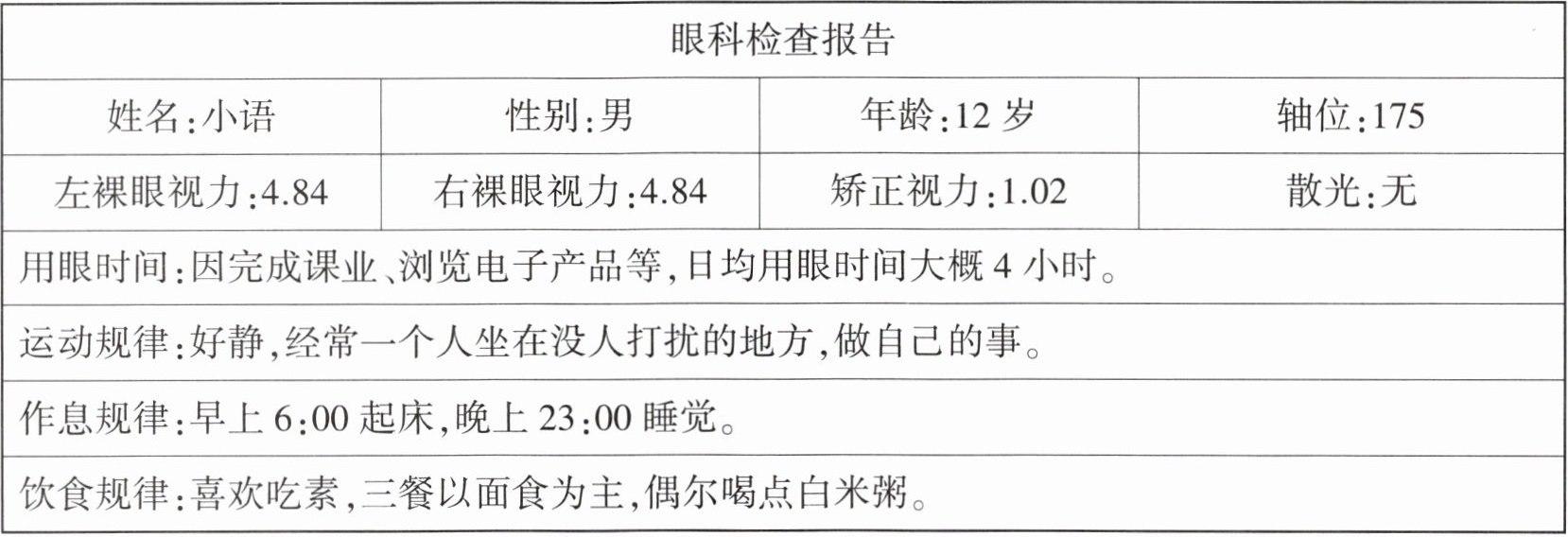 4. 在老师的建议下,小语去医院的眼科门诊做了一次检查,下面是他的检查报告,请你结合【材料三】给小语提供一些有助于改善和提高视力的建议。(4 分)