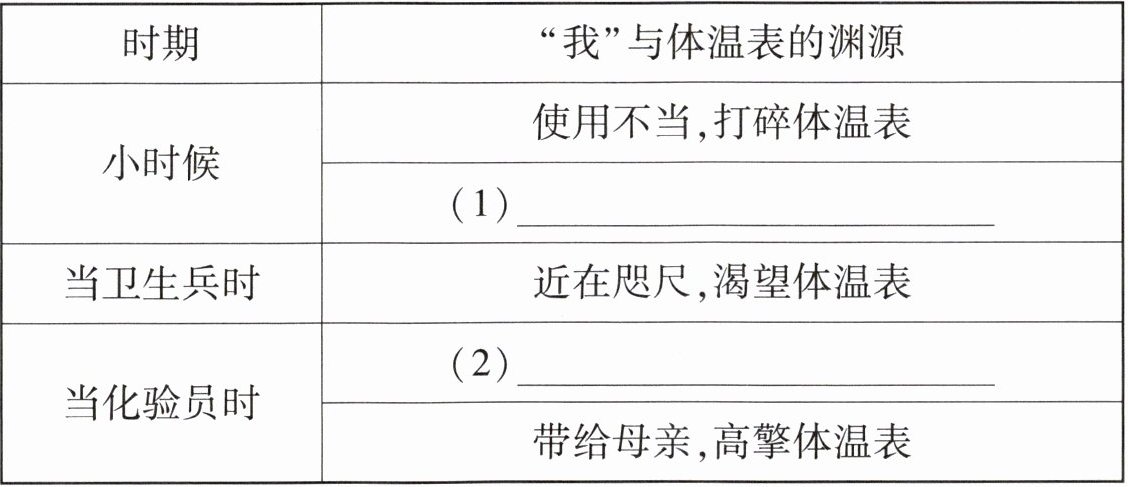 3. 本文围绕“体温表”展开,娓娓讲述作者的成长经历,请你把“我”与“体温表”之间的渊源填写完整。(2 分)