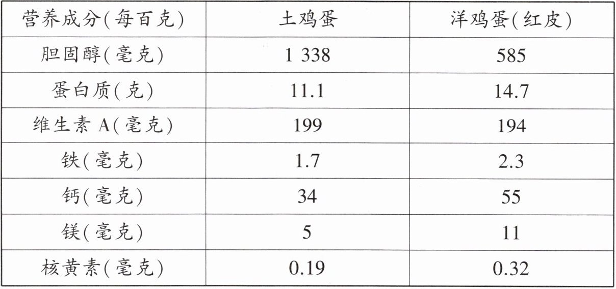 | 营养成分(每百克) | 土鸡蛋 | 洋鸡蛋(红皮) |