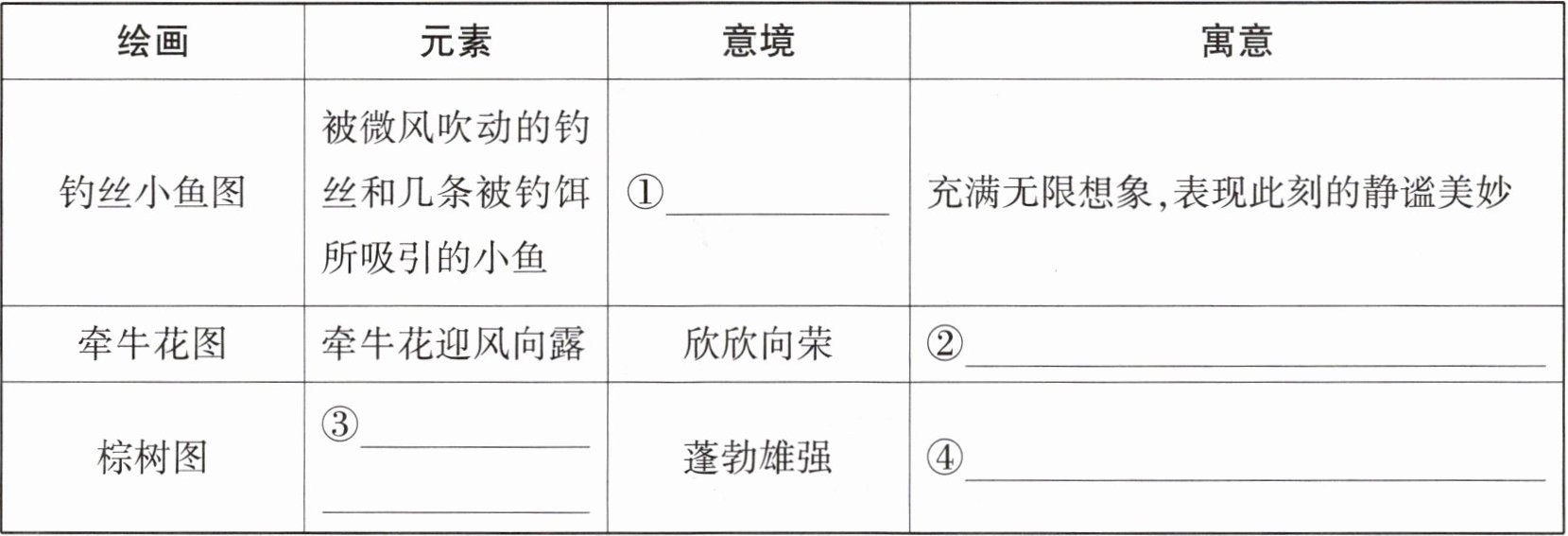 2.【赏画】小语对齐老的“钓丝小鱼图”“牵牛花图”和“棕树图”三幅画进行了整理,请你帮忙补充完整下面的表格。(4 分)