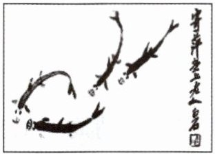 ⑤老舍先生收藏了一幅白石老师的钓丝小鱼图。图中很大的篇幅只有一根被微风吹动的钓丝,下边是几条被钓饵所吸引的小鱼,墨色淡淡的。画面似乎没有什么东西,但是,我们眼前却似乎浮现出这样的场景——晚风习习,天边一抹晚霞,人在清澈的池塘边观看游鱼,闲适惬意。画面上那一根钓丝给人无限的想象和美妙的感觉。这张画使我们深深体会到白石老师感觉的敏锐和感情的真挚。更可贵的是这些作品的思想感情与我们的思想感情息息相通,不感觉有什么疏远和隔膜。