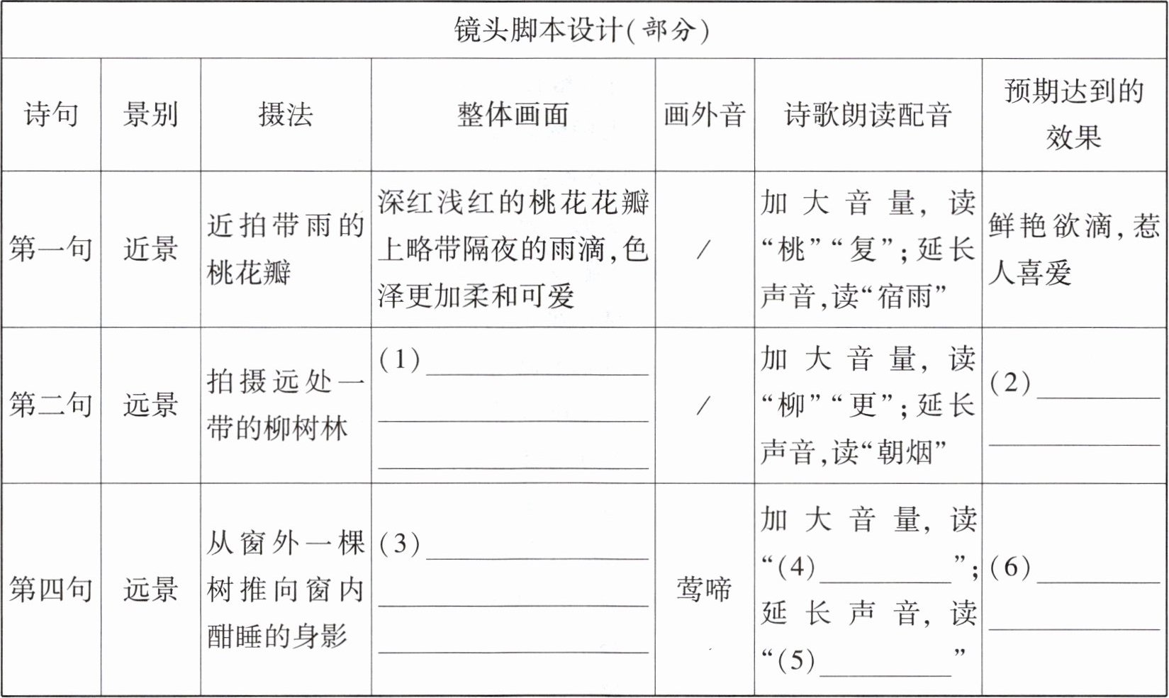 新考法 1. 小语想为这首诗制作一个小视频,下面是这个镜头脚本设计表格(部分),请你帮一帮她,完成表格吧!(6 分)