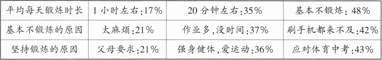 |平均每天锻炼时长|1 小时左右:17%|20 分钟左右:35%|基本不锻炼:48%|
