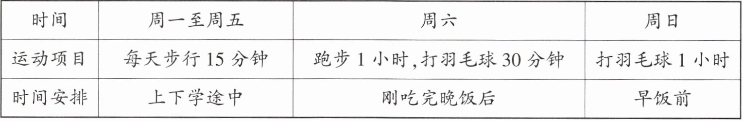 |运动项目|每天步行 15 分钟|跑步 1 小时,打羽毛球 30 分钟|打羽毛球 1 小时|