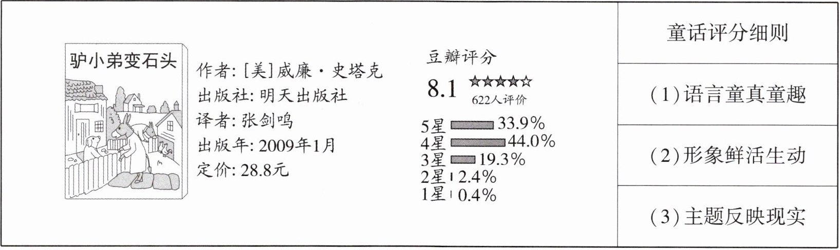 10. 绘本《驴小弟变石头》在豆瓣上评分很高。请在下面童话评分细则中,任选一条,结合文章内容说明其评分高的原因。(4 分)