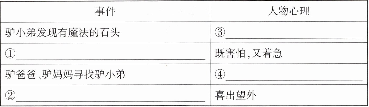 6. ①驴小弟变成了一块岩石 ②驴小弟变回了自己 ③又惊又喜 ④急得要发疯了,伤心极了(4 分)