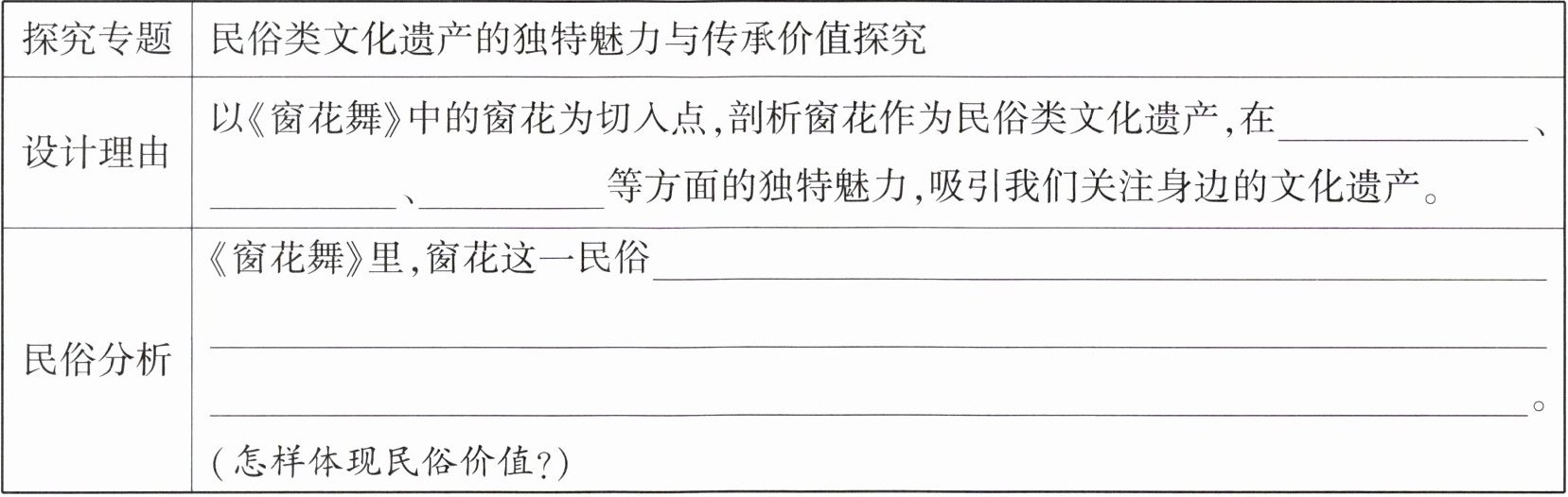|设计理由|以《窗花舞》中的窗花为切入点,剖析窗花作为民俗类文化遗产,在______、______、______等方面的独特魅力,吸引我们关注身边的文化遗产。|