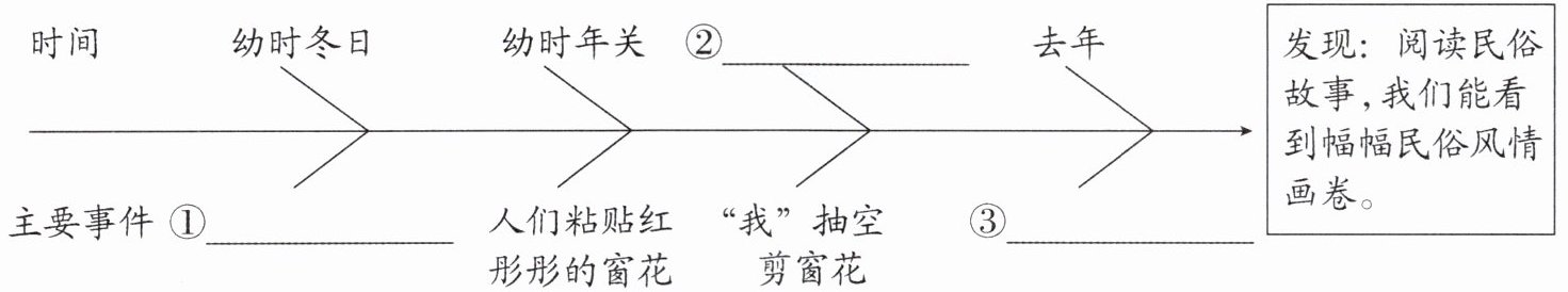 |主要事件|①______|人们粘贴红彤彤的窗花|"我"抽空剪窗花|③______|