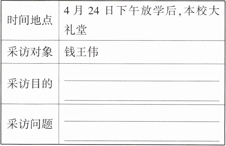 (3)【名人事迹】2024 年 3 月 20 日,南通姑娘钱王伟在巴西残疾人场地自行车世锦赛 3000 米追逐赛中斩获金牌。小语收集了有关她的材料,准备对她进行采访,请你帮助她完善提纲。(4 分)