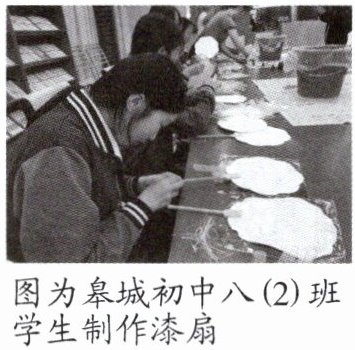 7. 2024 年 12 月 10 日,皋城初中将传统技艺漆扇带进八年级非遗课堂,孩子们专心致志,在学习中接受传统文化的熏陶。他们首先精细切割和打磨扇骨,然后运用大漆上色,烘干后表面变得坚固而光滑,最后运用漆艺彩绘的技巧绘制个性化的图案,展现出独特的艺术魅力。非遗进课堂,更好地促进传统文化的传承和发展。(4 分,意对即可)