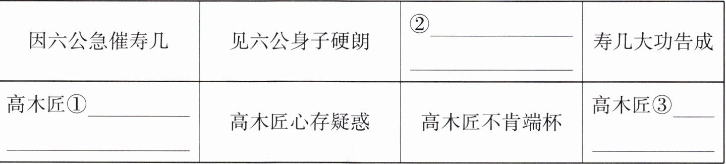 |六公|因六公急催寿几|见六公身子硬朗|②______|寿几大功告成|