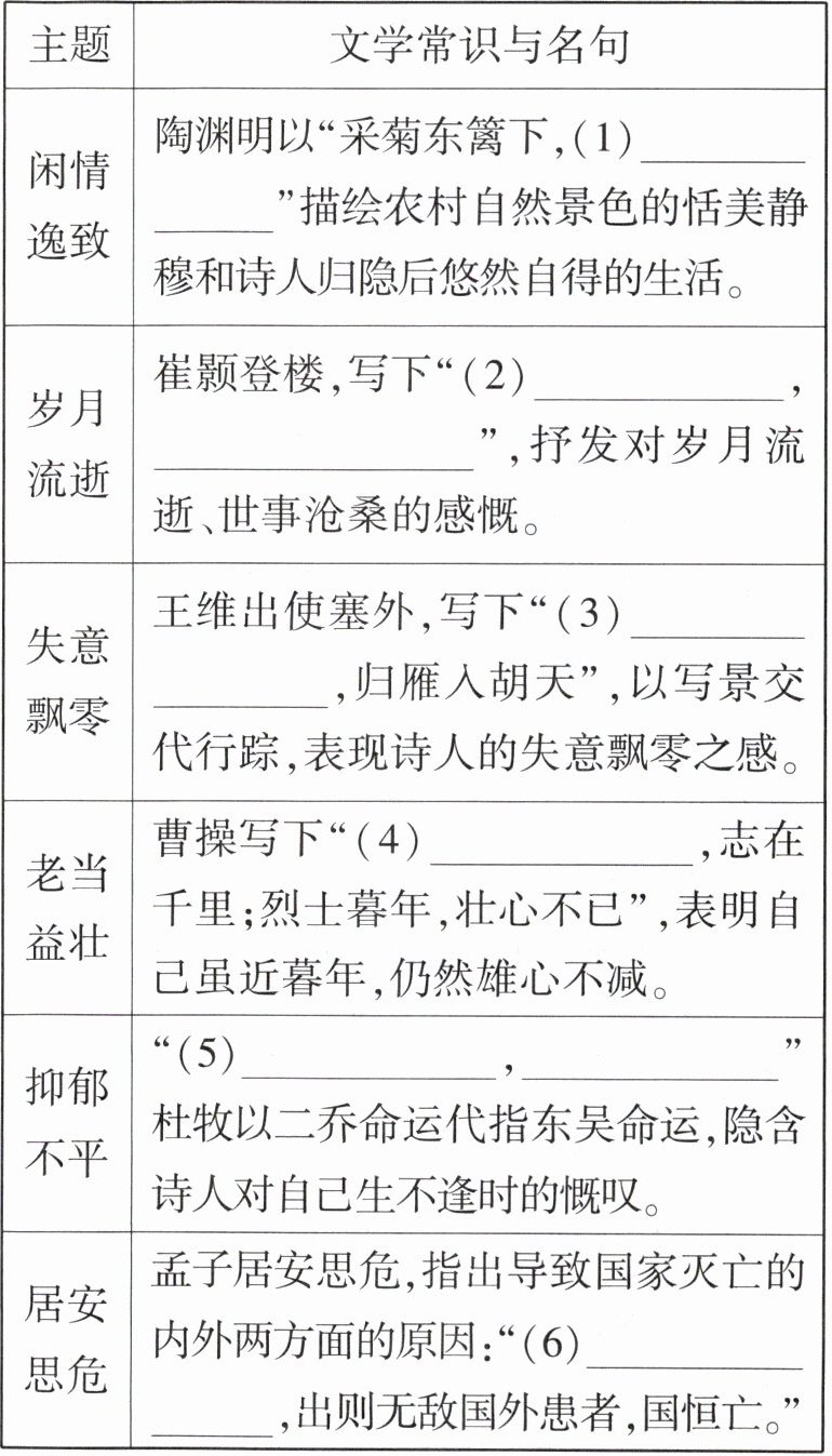 | 闲情逸致 | 陶渊明以“采菊东篱下,(1)______”描绘农村自然景色的恬美静穆和诗人归隐后悠然自得的生活。 |