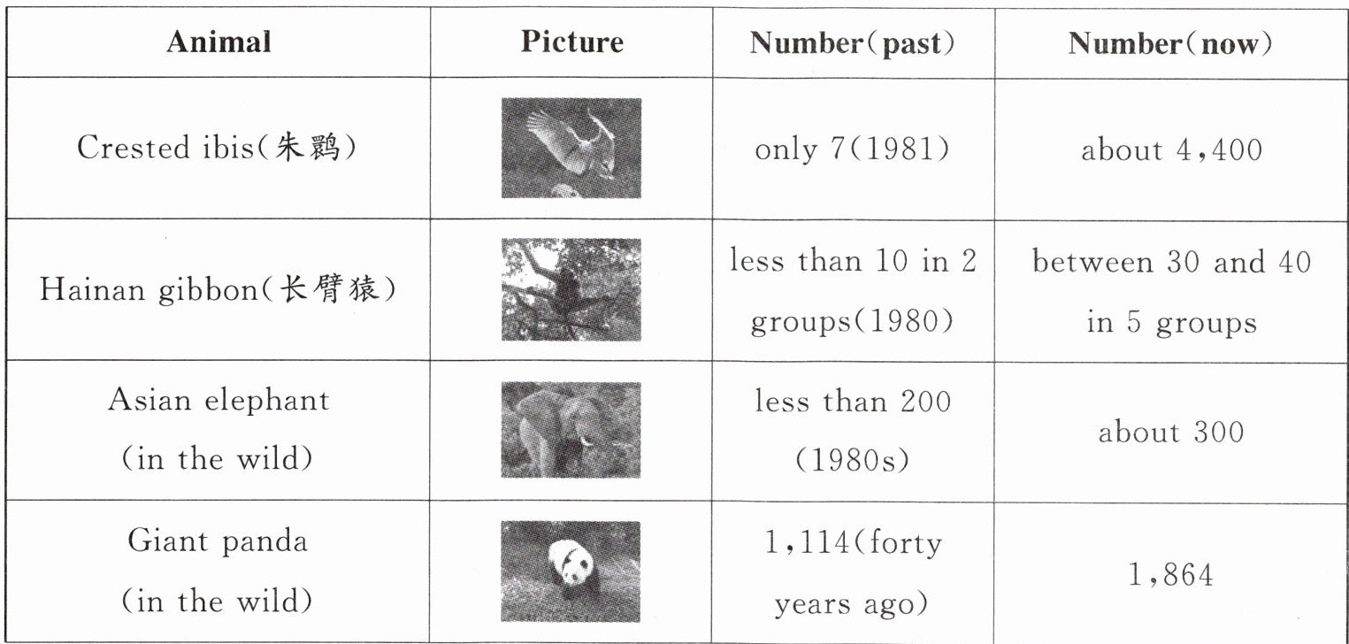 )27. Which animal sees the largest rise in numbers?A. Crested ibis. B. Hainan gibbon. C. Asian elephant. D. Giant panda.