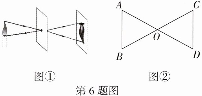 6. 跨学科情境 物理小孔成像 如图①是“小孔成像”的实验图片,图②是其简化示意图. 点 O 代表小孔,AB 代表蜡烛的火苗,CD 代表火苗在光屏上所成的像,$AB// CD$.已知当小孔到蜡烛的距离(物距)等于小孔到光屏的距离(像距)时,所成像的大小与火苗大小相等,请你用数学知识解释这种现象.