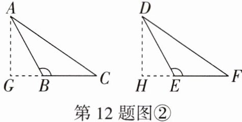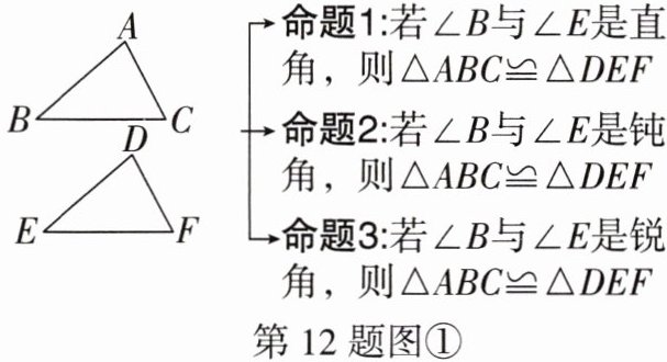 12. (中考新考法·补充证明过程)如图①,已知在△ABC和△DEF中,AB= DE,AC= DF,∠B= ∠E. 在此条件下,对它“强化条件”,分别得到下列三个命题.