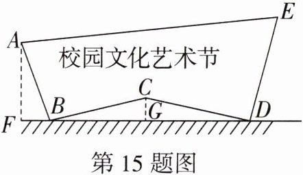 15. 日常生活情境 活动宣传板 育才中学打算举办校园文化艺术节,小西同学负责此次艺术节宣传板的制作任务,如图,将该宣传板垂直于地面放置时,点$A$,$C$,$E到地面的距离分别是60cm$,$20cm$,$80cm$,过点$A作AF⊥BD$,交$DB的延长线于点F$,过点$C作CG⊥BD于点G$.已知$AB= BC且AB⊥BC$,$CD= DE且CD⊥DE$.