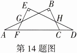 14. 如图,$Rt△ABC与Rt△DEF的顶点A$,$F$,$C$,$D$在同一条直线上,$AB与EF相交于点G$,$BC与DE相交于点H$,$∠B= ∠E= 90^{\circ}$,$AF= CD$,$AB= DE$.