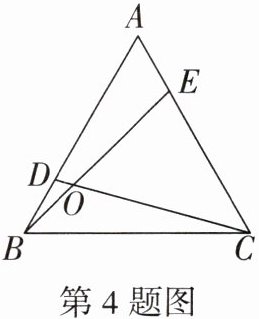 4. 如图,D,E分别是等边△ABC的边AB,AC上的点,CD,BE相交于点O,且∠DOB= 60°,求证:AD= CE.