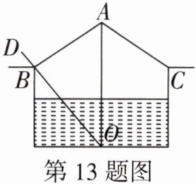 13. 王爷爷家有一片露天鱼池,为避免太阳直射,王爷爷在鱼池上方搭建了遮阳网。如图,鱼池的截面呈长方形,$ B $ 点到 $ C $ 点的距离为 $ 12 \mathrm{m} $,池子正中央的支撑杆 $ OA $ 高出 $ BC $ $ 4 \mathrm{m} $,$ AB $,$ AC $ 为同样大小的遮阳网,一根与 $ OA $ 长度大小均相同的支撑杆 $ OD $ 斜放在池内,且 $ BD = 2 \mathrm{m} $。求支撑杆 $ OA $ 的长。