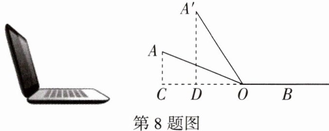 8. 电脑放置在桌面的示意图如图所示,当屏幕的张角为 $ \angle AOB $ 时,顶部边缘 $ A $ 处离桌面的高度 $ AC $ 为 $ 7 \mathrm{cm} $,此时底部边缘 $ O $ 处与 $ C $ 处之间的距离 $ OC $ 为 $ 24 \mathrm{cm} $;由于用眼舒适度不太理想,调整张角大小为 $ \angle A'OB $,此时底部边缘 $ O $ 处与 $ D $ 处之间的距离 $ OD $ 为 $ 15 \mathrm{cm} $,则顶部边缘 $ A' $ 处到桌面的距离 $ A'D $ 的长为