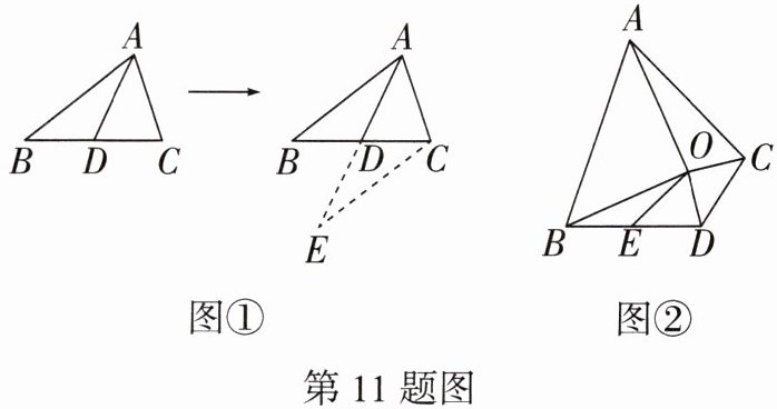 11. (中考新考法·解题方法型阅读理解题)【问题提出】倍长中线法是一种重要的解题方法,如图①,在△ABC中,AD是BC边上的中线,若延长AD至点E,使DE= AD,连接CE,可根据“SAS”证明△ABD≌△ECD,则AB= EC.