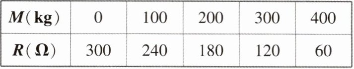 ∵由表格可知,当重物质量M每增加100 kg时,电阻R减小60 Ω,